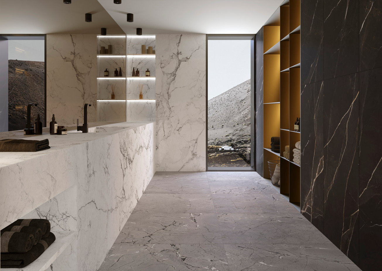 Avec ses quatre graphismes distincts — Iceberg, Thunder, Vulcano et Cliff — le carrelage Sublime Museum permet des combinaisons esthétiques variées et harmonieuses.