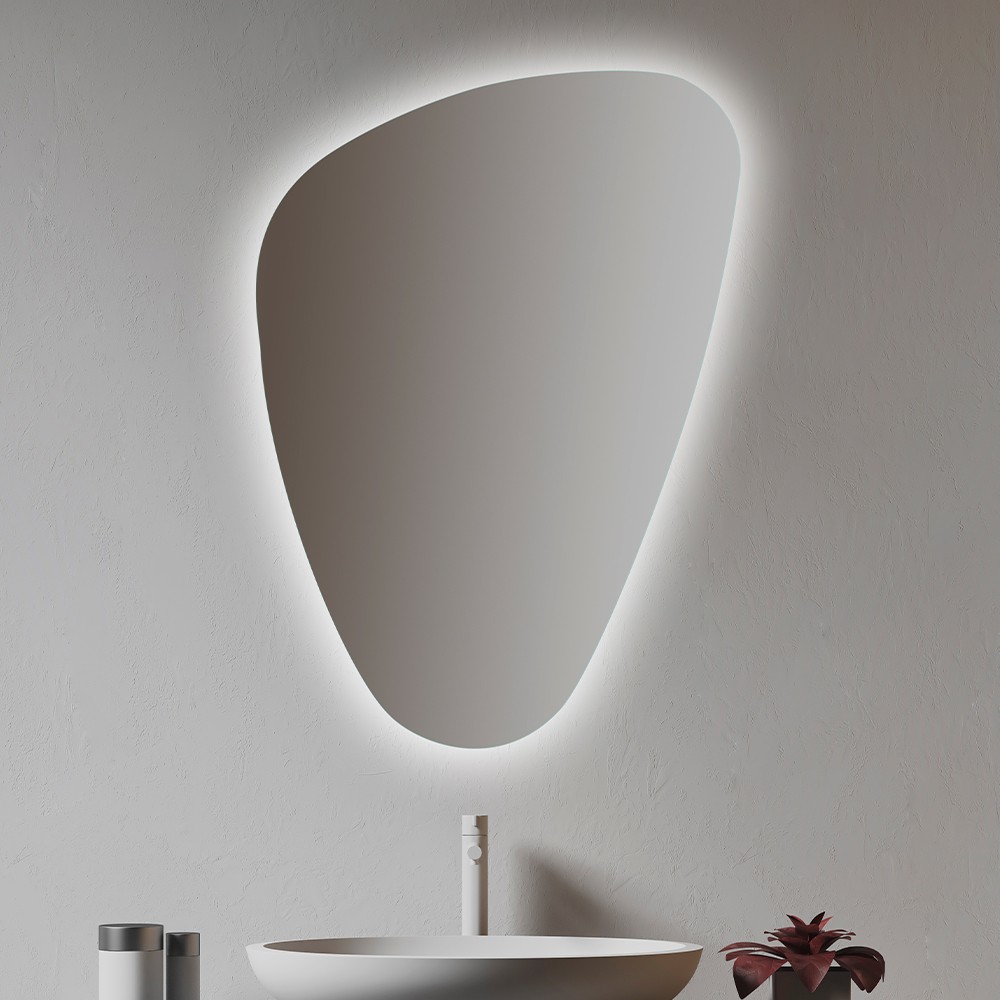 Miroir LED rétro-éclairant O’Design ILLUSION, forme ronde organique, avec système antibuée et interrupteur 3 positions. Élégance et confort pour votre salle de bain.