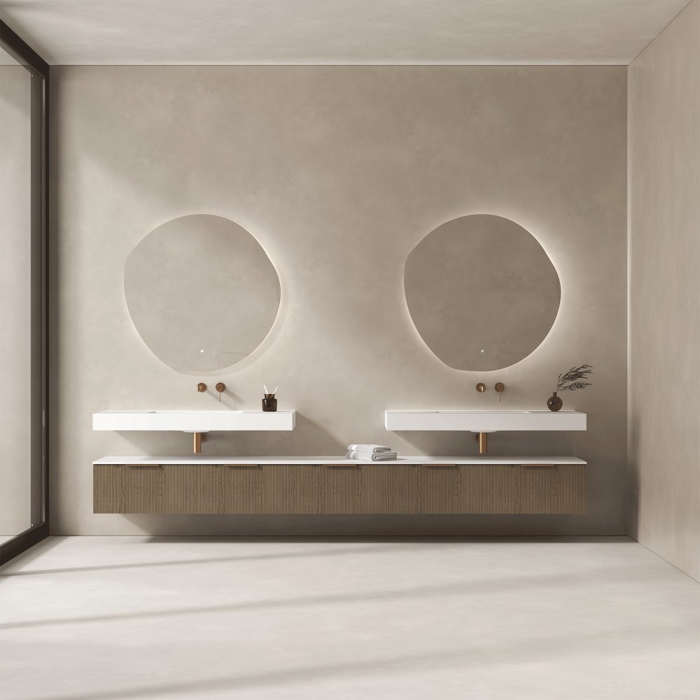(5.0 — Certifié qualité)Miroir LED rétro-éclairant O’Design ILLUSION, forme ronde organique, avec système antibuée et interrupteur 3 positions. Élégance et confort pour votre salle de bain.